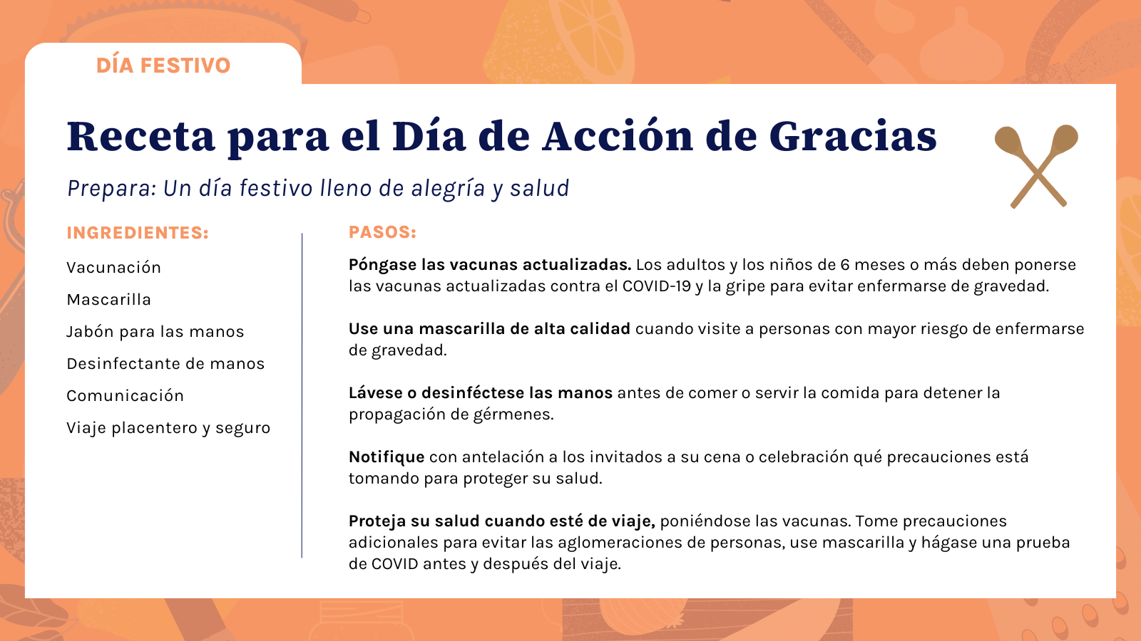 - ¿Cuál es el menú de su #DíadeAccióndeGracias2023? Si sigue la receta para tener un Día de Acción de Gracias seguro y saludable, podrán disfrutar el día festivo y a la vez protegerse todos del COVID-19 y la gripe. Infórmese más: [Enlace al PDF o a la página de inicio local/estatal]