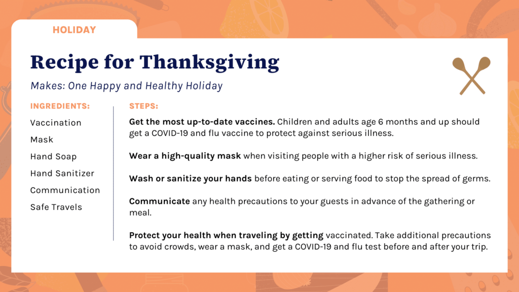 - What’s on the menu for your #Thanksgiving2023? By following the recipe for a safe and healthy Thanksgiving, you can enjoy the holiday and protect yourself and others from COVID-19 and the flu. Learn more: [Link to PDF or local/state landing page]